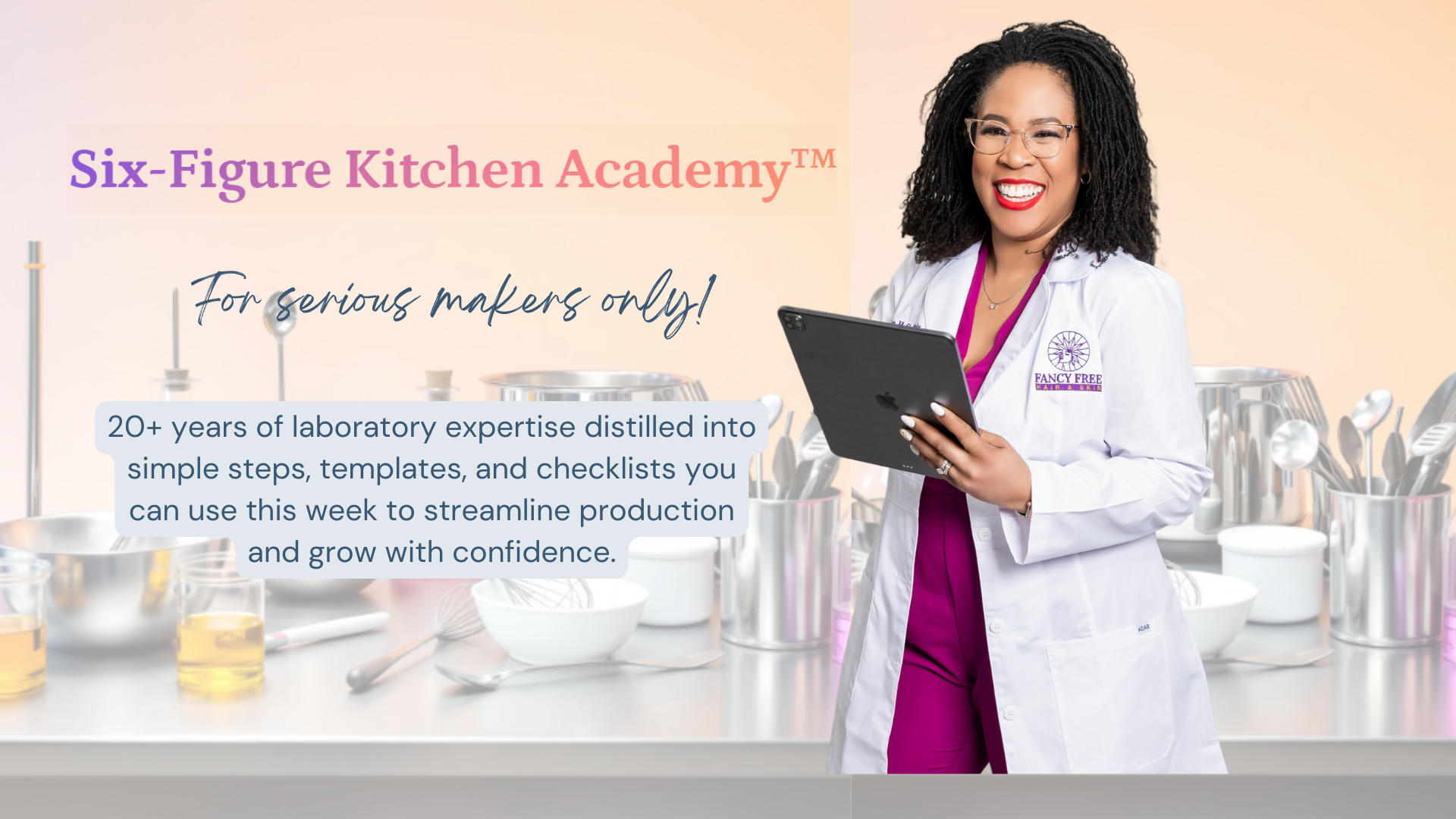 You’ve perfected your formulas. Now it’s time to perfect your process. The Six Figure Kitchen Academy shows personal care makers exactly how to streamline production, master GMP, and scale from your kitchen to a thriving, profitable beauty business.